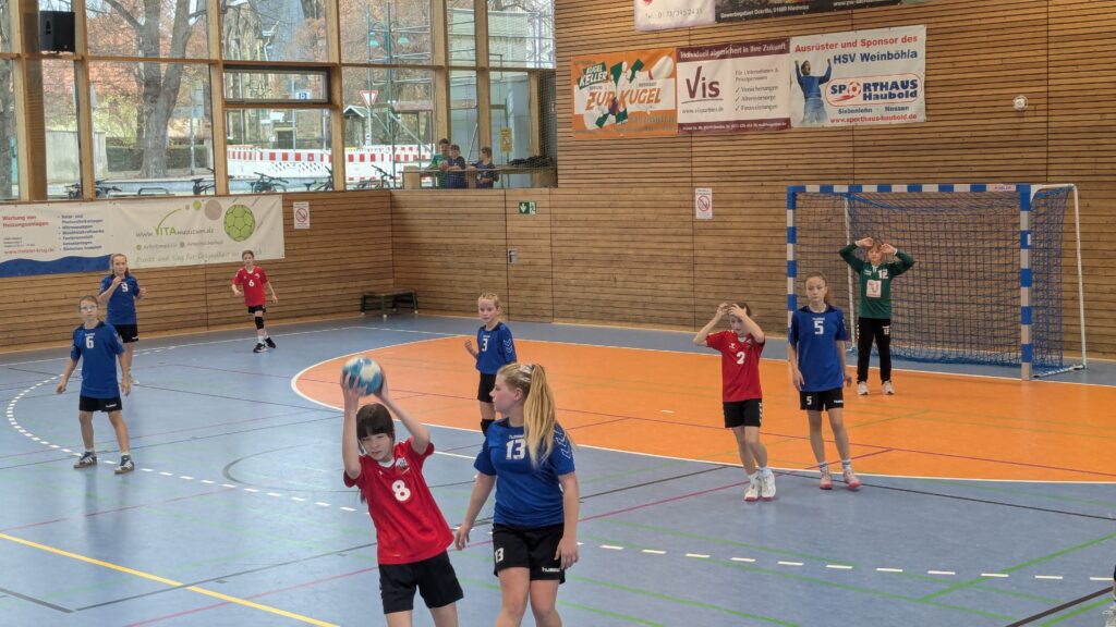 Nach dem Tausch der Seiten behielten die Weinböhlaerinnen weiter die Oberhand und erzielten im Angriffsspiel noch weitere 10 Tore. Allerdings konnten sich die Gegnerinnen ebenfalls mit 10 Toren belohnen, was auf einen Einbruch der Abwehrleistung unsererseits in der zweiten Hälfte hindeutet. Hätte man also nicht den großen Vorsprung gehabt, hätte es durchaus knapp werden können. Letztendlich gingen die D-Mädels aber mit einem Endstand von 21:14 zufrieden als Gewinner vom Feld.